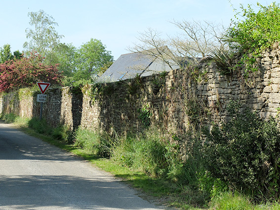 Juste en face, un autre muret qui symbolise à lui seul la lutte entre le monde campagnard encore vigoureux et celui des rurbains qui étend son emprise. Sans être très féru de korriganosophie, on devine facilement que le rajout moderne a tout pour faire fuir le plus intrépide des gnomes.