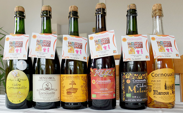 Ci-dessus, le cidre Maley produit en Vallée d’Aoste, le cidre Finnbarra produit en Irlande près de Kinsale et ci-dessous six AOP Cornouaille.