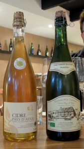 Du Domaine de la Galotière encore, l’AOP Pays d’Auge cuvée Prestige. Nous avons apprécié la jolie sonorité au débouchage, gai et enjouée. S’il est légèrement voilé dans le verre, l’effet de mousse est très sympathique. Le nez est un peu distant, légèrement fermentaire avec du fruit d’été, on pressent un cidre un assez sec. De fait l’équilibre sucré acidulé est plus frais avec une légère astringence en fin de bouche. C’est un bon cidre pour accompagner le repas.