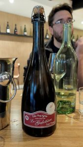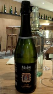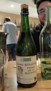 Loin des sophistications du Pays d’Auge, un cidre de la Ferme de la Bonnerie en Seine et Marne. Il est clair et brillant, peu effervescent. Le nez est un peu végétal avec de la pomme cuite qui fait penser à un jus de pomme. La bouche est un peu plate avec seulement quelques notes d’acidité. La finale est assez brève. Nous ne l’avons pas trouvé d’un grand intérêt gustatif, mais Claude Goenvec nous a fait remarquer que cela pourrait refléter les sols limoneux de ces régions