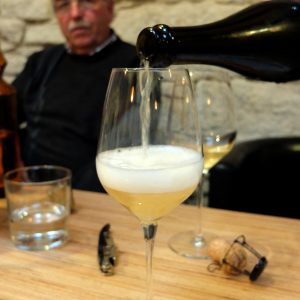 Nous avons ensuite testé le Friardel 2015 qui se différencie, au dires de la contre-étiquette, par une proportion différente des types de pommes à cidre. La présentation est assez proche, l’orange est un peu plus soutenu et le voile peut-être plus présent. Le nez est doux, mais peu expressif avec des notes animales sous le fruit. En bouche, l’attaque est douce, voire molle, mais il y a de la rondeur, de l’amplitude avec toujours cette petite point d’astringence. La finale est un peu courte moyennement parfumée. C’est un beau produit qui présente bien, ne déçoit pas, mais manque un peu conviction.