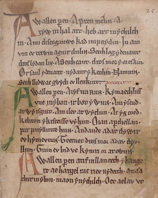La première page d’Afallenu, du Barde Myrddin (Marzhin), dans le Black Book of Carmarthen, conservé à la National Library of Wales