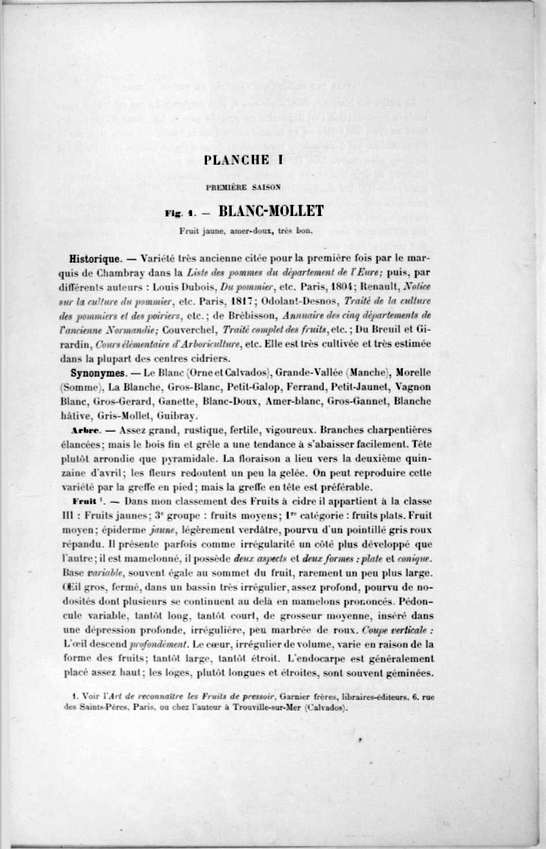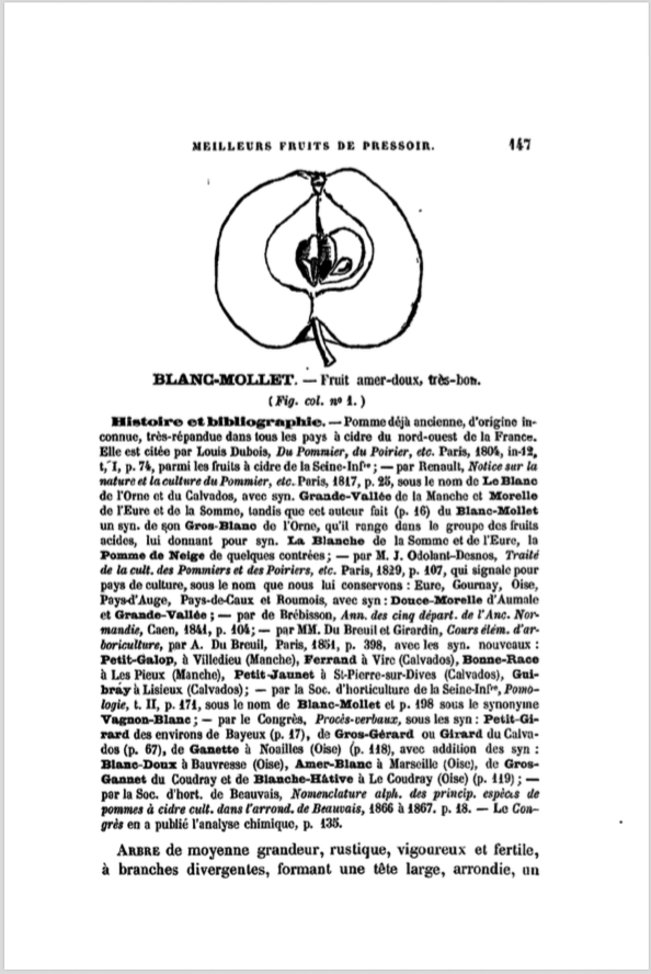 À la page 424 de son Traité des Fruits tant Indigènes qu’Exotiques (1839), Jean François Couverchel écrit ; “Pomme blanc-mollet, douce, amère; bonne espèce, très productive; cidre bon qui se conserve longtemps, pays d’Auge, Eure.–Douce Morelle d’Aumale, Grande Vallée, Gournay pays de Caux, Roumois, Oise.”