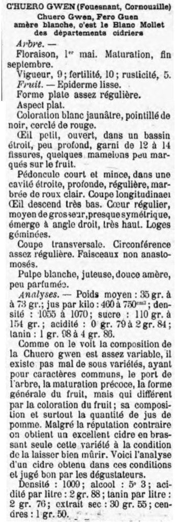 On trouvera dans Pommier à Cidre, J.M. Boré & J. Fleckinger, 2002 (p. 146-148), dans Du pommier au cidre, C. Jolicœur, 2016 (P. 73-74) ou Pommes et cidre en Cornouaille, Mark Gleonec, 2019 (p. 48-40), des notes récentes sur La C’hwerv-gwenn et la Blanc-Mollet.