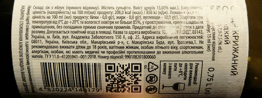 Le producteur Vitalii Karvyha est un œnologue Ukrainien de grande réputation qui travaille aussi bien la pomme que le miel. Il se trouvait à Varsovie pour le “Mead Madness Cup” avec le Concarnois Sylvain Le Cras qui nous a rapporté cette bouteille, lorsque les Russes ont envahi son pays. C’est peu de chose, mais il nous a semblé qu’il fallait que nous dégustions son cidre de glace afin de lui témoigner notre soutien. Il s’agit la d’une interprétation douce de cette spécialité canadienne, Vitalii Karvyha s’attachant à produire des boissons à la fois peu alcoolisées et savoureuses. Au service cela donne de jolis verres habillés de couleur paille. Au nez la pomme cuite propose des senteurs flatteuses de tatin juste sortie du four. La bouche, douce et équilibrée apporte des notes de miel sur un fond délicatement citronné. Une très belle réalisation qui démontre toute la maîtrise du producteur.