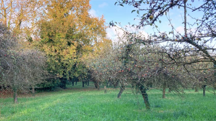 Je me fis donc indiquer quel verger produisait encore ce petit fruit. On me l’indiqua avec autant de précisions et de précautions que s’il s’agissait de donner l’emplacement d’un trésor. Je m’y rendis quelques jours plus tard en fin d’après-midi en prenant soin de garer mon véhicule suffisamment loin. Je traversais une prairie de hautes herbes trempées par la pluie, puis la haie protégeant la parcelle du vent, comme des regards, et me mit à arpenter ce verger que je n’avais jamais visité à ce moment de l’année. C’est beau un verger de pommiers dans le jour déclinant sous un ciel menaçant. Les pommes encore accrochées aux branches formaient des constellations dans le gris des nuages et sur le sol les herbes recouvraient déjà celles laissées par les ramasseurs. Celles là faisaient le bonheur des oiseaux, des insectes volants, des myriapodes et leurs compagnons des herbes et de toute la faune du sous-sol. Il ne fut pas difficile de repérer les quelques pommiers de Dous-Bolonjær dans l’alignement impeccable des arbres.
